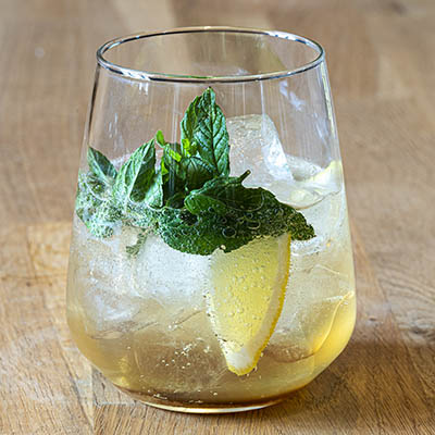 Strite metine liste z demerara sladkorjem in nato zgradite pijačo na ledu